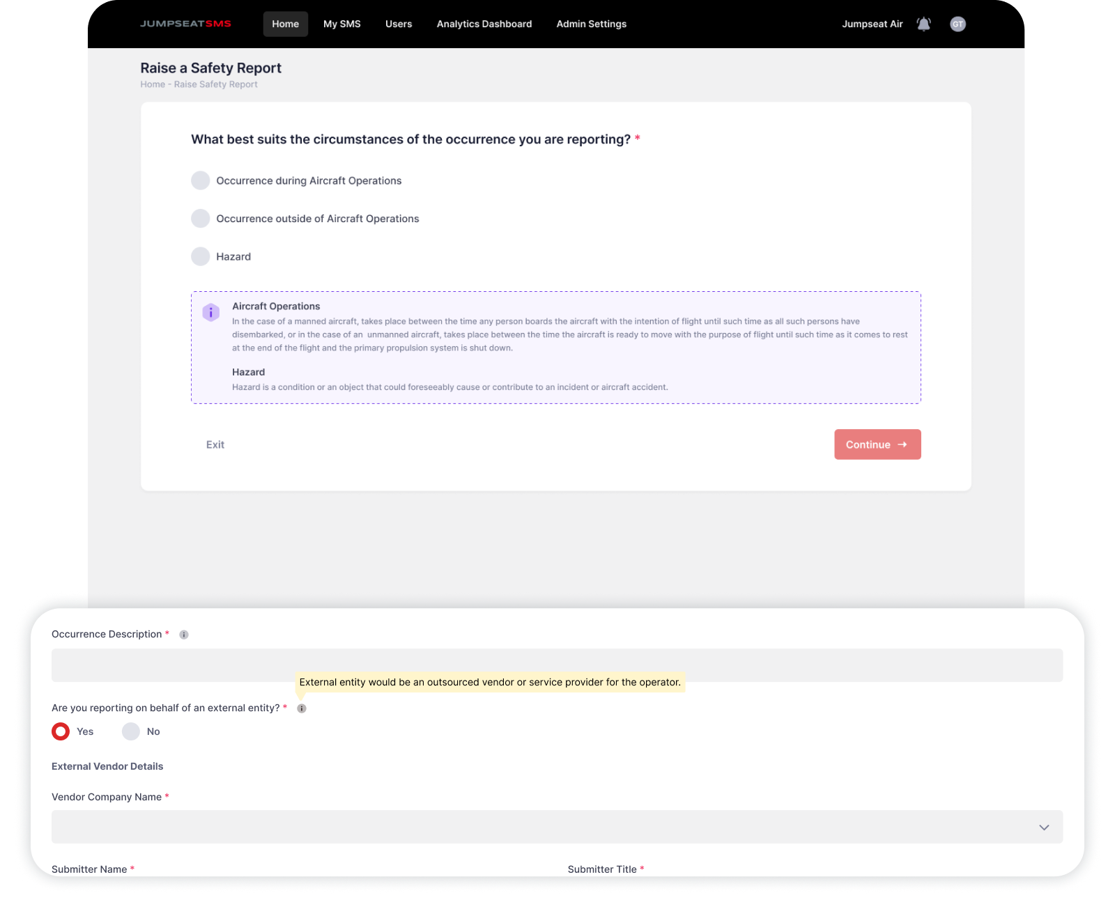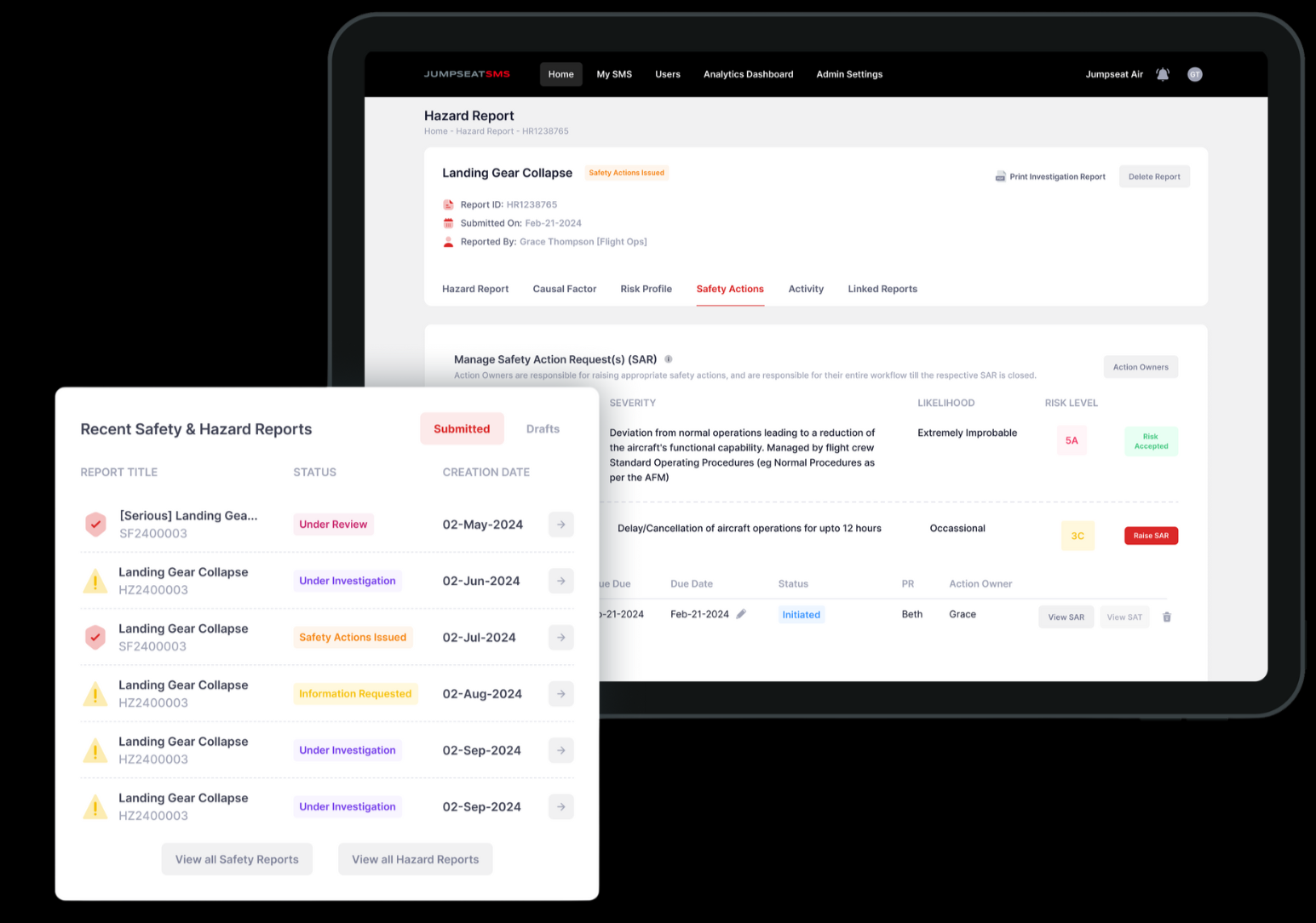 Engineered by experts with extensive experience in aviation safety, with the dynamic operational environment of aviation professionals in mind, JumpseatSMS integrates a comprehensive suite of tools to simplify safety management and operational efficiency in one intuitive platform.