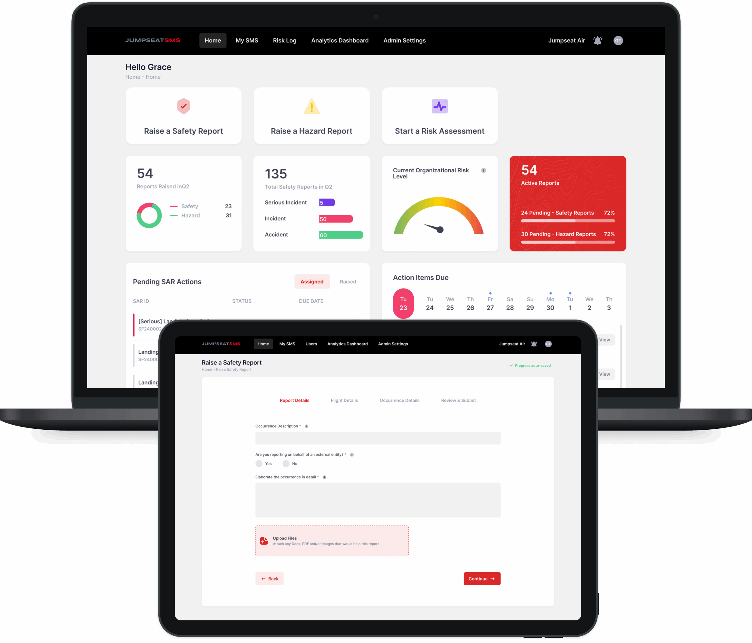 Engineered by experts with extensive experience in aviation safety, with the dynamic operational environment of aviation professionals in mind, JumpseatSMS integrates a comprehensive suite of tools to simplify safety management and operational efficiency in one intuitive platform.