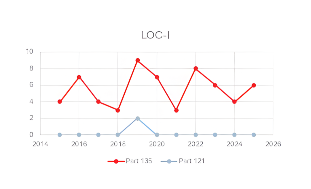A review of NTSB’s data set for accidents and serious incidents in the United States for Part 135 and Part 121 operators shows the following trend for LOC-I. The data shown in the chart below indicates that LOC-I is more prevalent in Part 135 Operations than in Part 121 Operations.